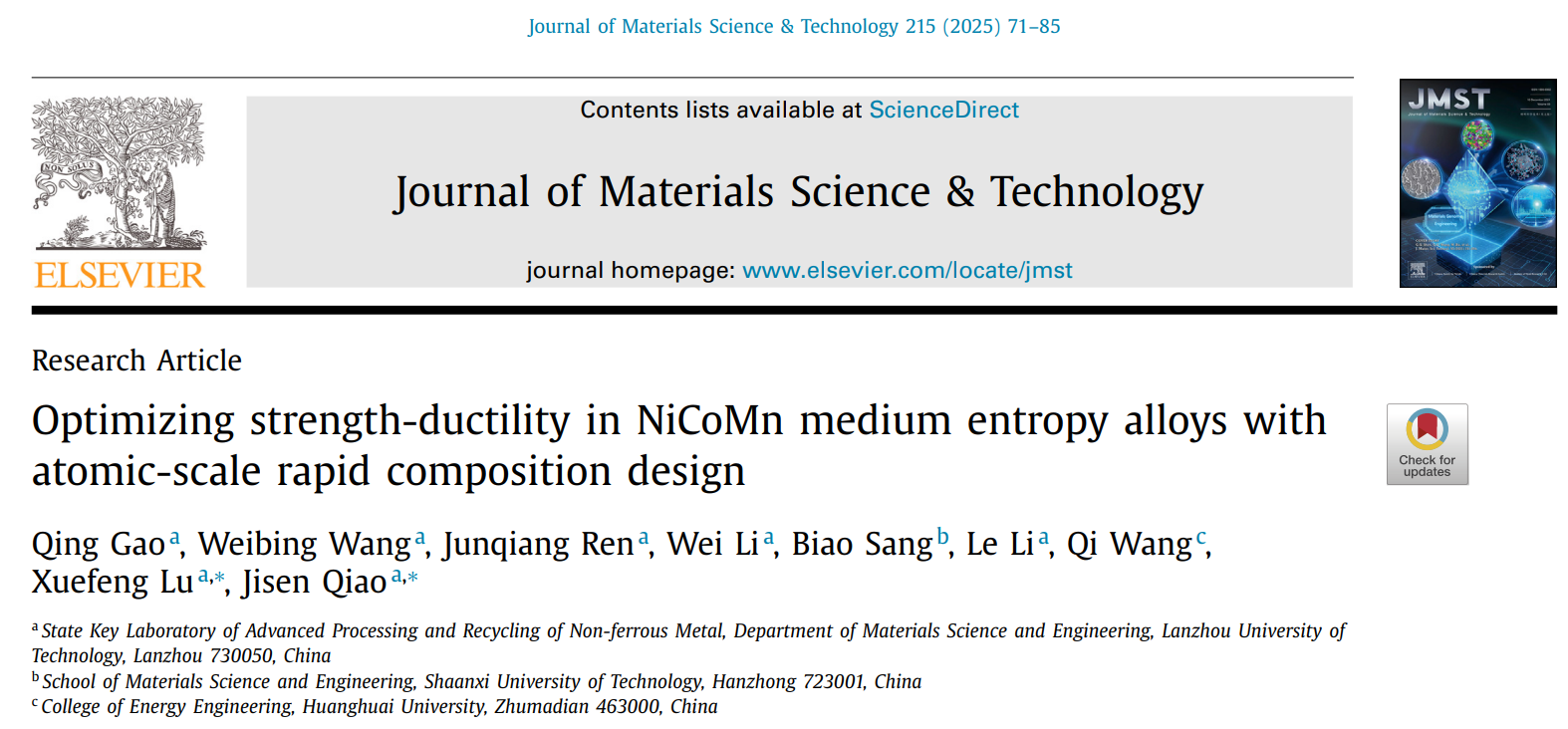 研究工作由喬及森教授、盧學峰教授、任軍強副研究員和黃淮學院王啟副教授團隊合作完成。蘭州理工大學省部共建有色金屬先進加工與再利用國家重點實驗室為第一完成單位,黃淮學院能源工程學院和陜西理工大學材料科學與工程學院為合作單位。博士研究生郜清為第一作者,喬及森教授和盧學峰教授為通訊作者。