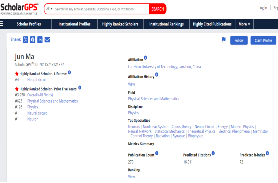 馬軍,男,1973年4月生,物理學(xué)博士、蘭州理工大學(xué)教授二級、博士生導(dǎo)師,現(xiàn)任《蘭州理工大學(xué)學(xué)報》主編、Nonlinear Dynamics終身編委,副主編和收稿編輯,Cognitive Neurodynamics副主編。主要研究方向:非線性物理及交叉學(xué)科,包括非線性電路設(shè)計、計算神經(jīng)科學(xué)和機械臂控制等,涵蓋數(shù)學(xué)、物理、計算機和工程學(xué)等學(xué)科。主持完成國家自然科學(xué)基金4項(面上項目2項),參與國家自然科學(xué)基金4項;出版專著2部,發(fā)明專利授權(quán)2項。在SCI收錄期刊發(fā)表學(xué)術(shù)論文358篇,論文被SCI數(shù)據(jù)庫總引用13300余次,SCI論文H指數(shù)64, 先后有40余篇論文入選ESI高被引論文和熱點論文,本期(2025年1月ESI數(shù)據(jù))ESI高被引論文31篇,熱點論文1篇。研究成果先后獲得甘肅省自然科學(xué)獎三等獎和二等獎各一項,指導(dǎo)的碩士研究生中有5名同學(xué)的學(xué)位論文獲得甘肅省優(yōu)秀碩士學(xué)位論文。