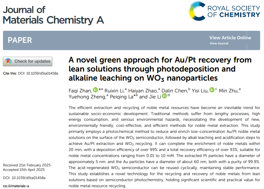 近日,蘭州理工大學省部共建國家重點實驗室喇培清教授團隊在光催化回收提取微量貴金屬方面取得重要進展,并以題為“A novel green approach for Au/Pt recovery from lean solutions through photodeposition and alkaline leaching on WO3nanoparticles”發表在材料科學領域Top期刊《Journal of Materials Chemistry A》上(IF10.8 /Q1)。