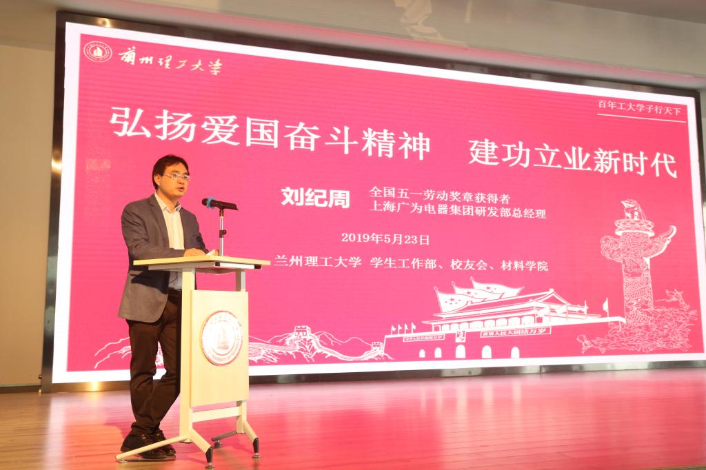 5月23日下午,“弘揚愛國奮斗精神、建功立業(yè)新時代”全國五一勞動獎章獲得者上海廣為電器集團有限公司劉紀周杰出校友勵志報告及暨贈送錦旗儀式在蘭工坪校區(qū)大學生活動中心舉行。上海廣為電器集團有限公司人事部經(jīng)理田敏、學校黨委副書記丁虎生、劉紀周導師陳克選教授、學校校友總會、黨委學生工作部、材料學院負責人等約500多人參加了報告會。報告會由校友總會主任劉全恩主持。