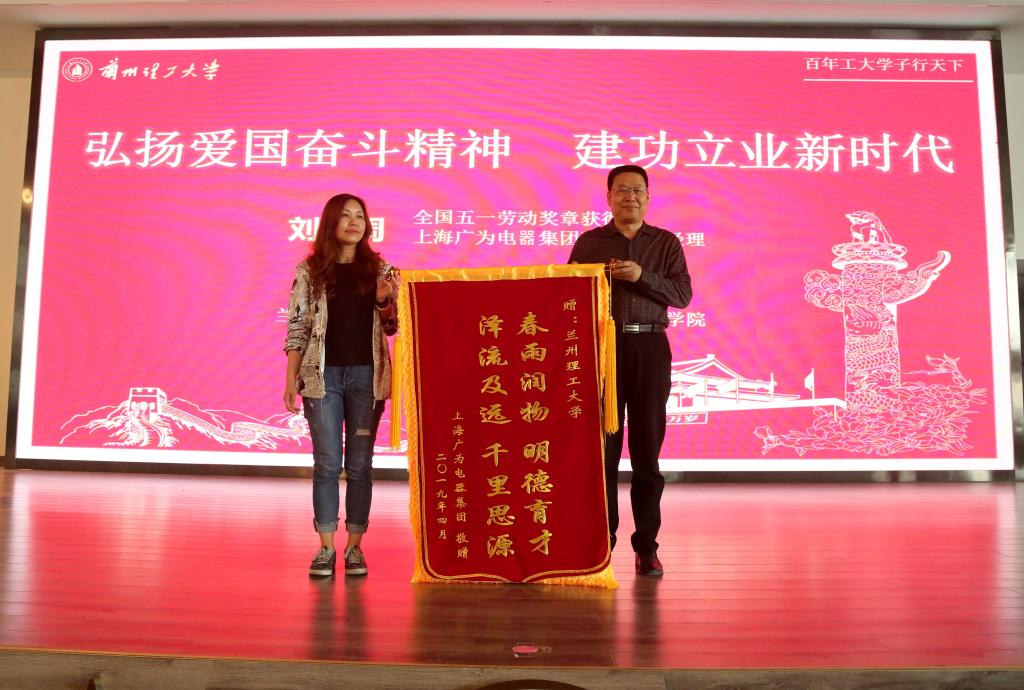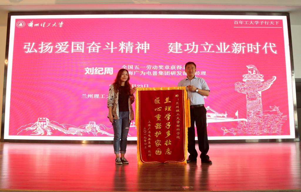 丁虎生代表學校感謝上海廣為電器集團有限公司對蘭州理工大學的支持與幫助,向劉紀周校友表示衷心地祝賀和熱烈的歡迎。他表示,值此中華人民共和國成立70周年、蘭州理工大學建校100周年之際,劉紀周、劉霞、黃志偉三位校友獲得“全國五一勞動獎章”,這是學校教育教學標志性成就的一次展示。全校師生要學習以劉紀周為代表的杰出校友學有所成、不懈追求的人生品格。肯學肯干肯鉆研,用干勁、闖勁、鉆勁鼓舞更多的工大人,激勵更多的工大人做新時代的奮斗者,努力創(chuàng)造無愧于時代的新業(yè)績。