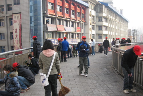 木工程學院青年志愿者對西站圓形天橋上的污垢、垃圾進行了徹底全面的清理