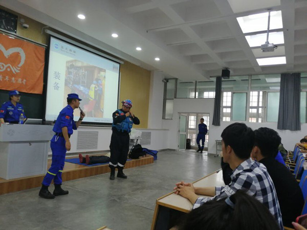6月18日下午,甘肅藍天救援隊在校本部1南502教室召開安全知識宣傳講座,外國語學院2018級全體學生參會。